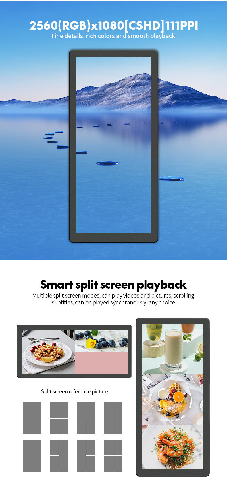 The elevator advertising machine can be played on separate screens, and the screens can also be arbitrarily allocated according to the size of the advertisement. Multiple screens can be played at the same time without interfering with each other. There is no limitation on the style of playing materials. Both video and graphics are available.