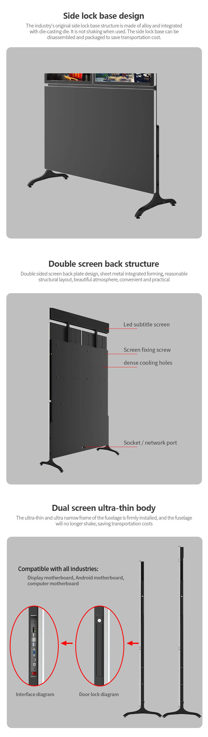 Dual screen solution is also available, can be double sided floorstanding totem, dual screen facing the same direction, or two screens stand back to back.